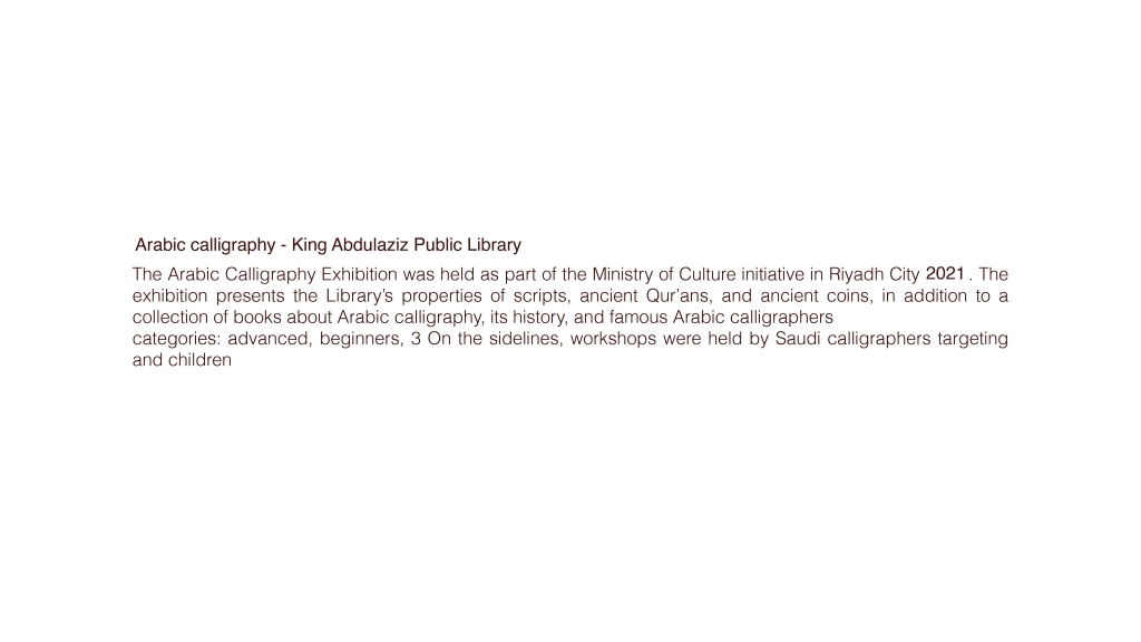The Arabic Calligraphy Exhibition was held as part of the Ministry of Culture initiative in Riyadh City 2021. The exhibition presents the Library’s properties of scripts, ancient Qur’ans, and ancient coins, in addition to a collection of books about Arabic calligraphy, its history, and famous Arabic calligraphers.